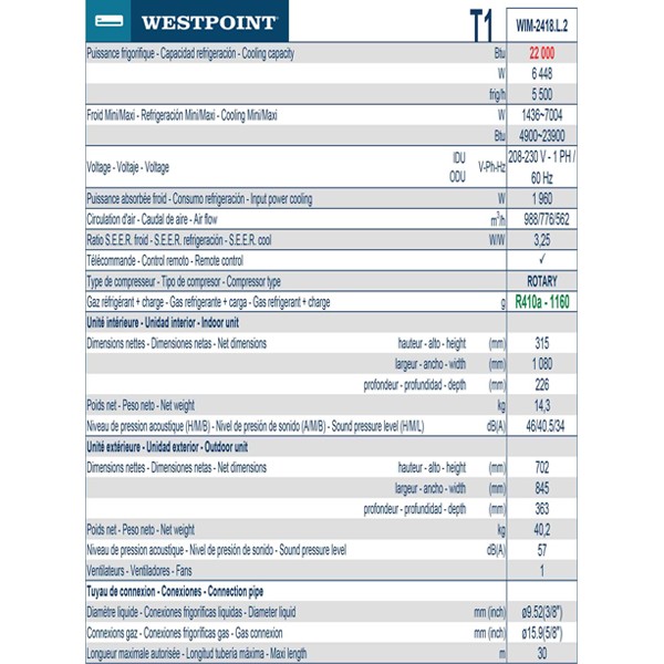 WIM-2418.L.2 – Air Conditioner Split Inverter 24,000 BTU 220 Volts Westpoint