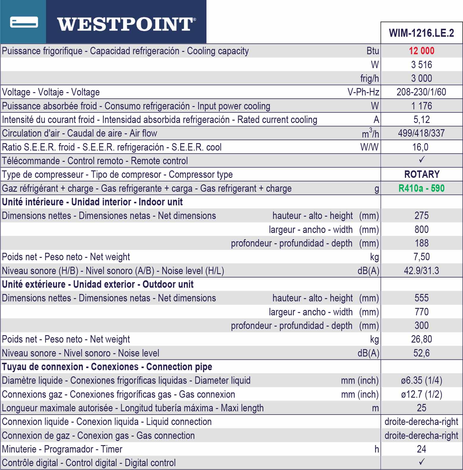 WIM-1216.LE – AIR CONDITIONNER SPLIT 12000BTU 220V INVERTER WESTPOINT